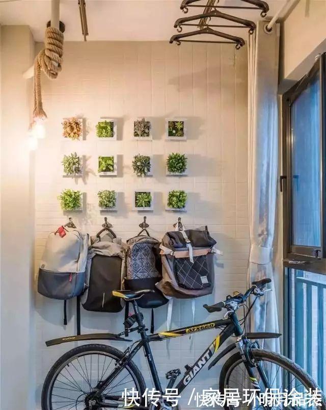 客厅外连接的阳台一侧墙面用花草装饰,配置了晒衣架,另一侧准备规划出小书房,方便在家时临时办公使用,设施还没有到位。