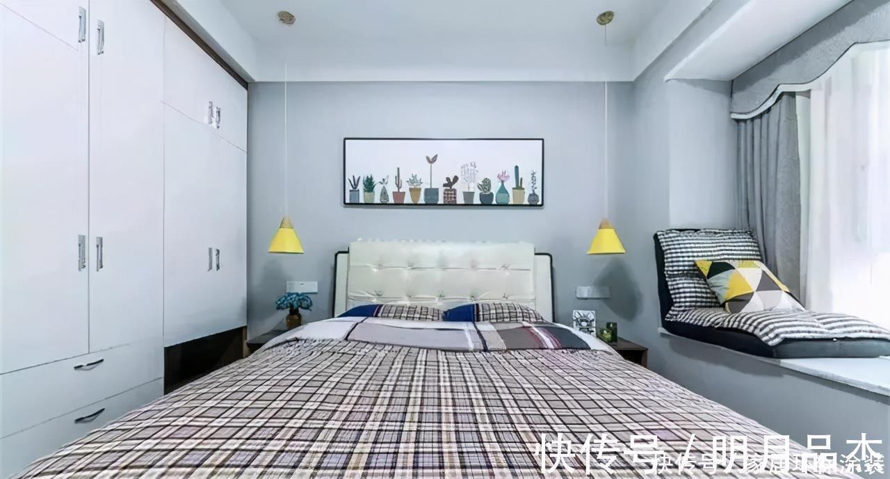 主卧室内布局紧凑,除了了一张宽大舒适的大床和两侧的床头柜,再定做一排到顶的组合大衣柜外,基本上就剩过道的位置,让卧室储物空间充足,温馨实用舒适。