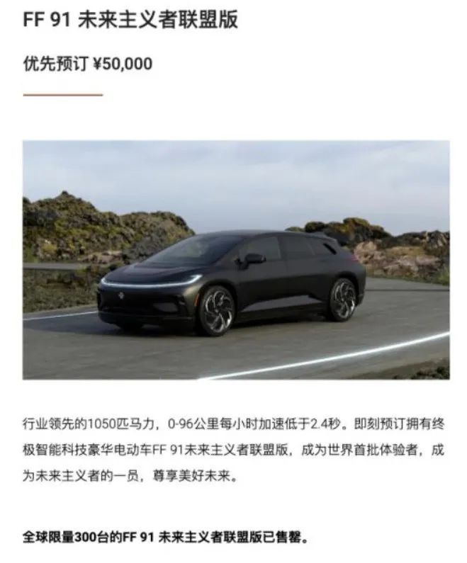 日前,我们从法拉第未来官方渠道获悉,全球限量300台的FF 91“未来主义者联盟版”已经售罄。新车已于7月22日正式开启预订,优先预订金额为5万元,有消息指出,新车的国内售价或将超280万元。我们从官网获悉,新车拥有1050马力,0-96km/h加速时间不到2.4秒,同时除了FF91未来主义联盟版,FF91未来主义者也开启了预订,定金为2万元。
